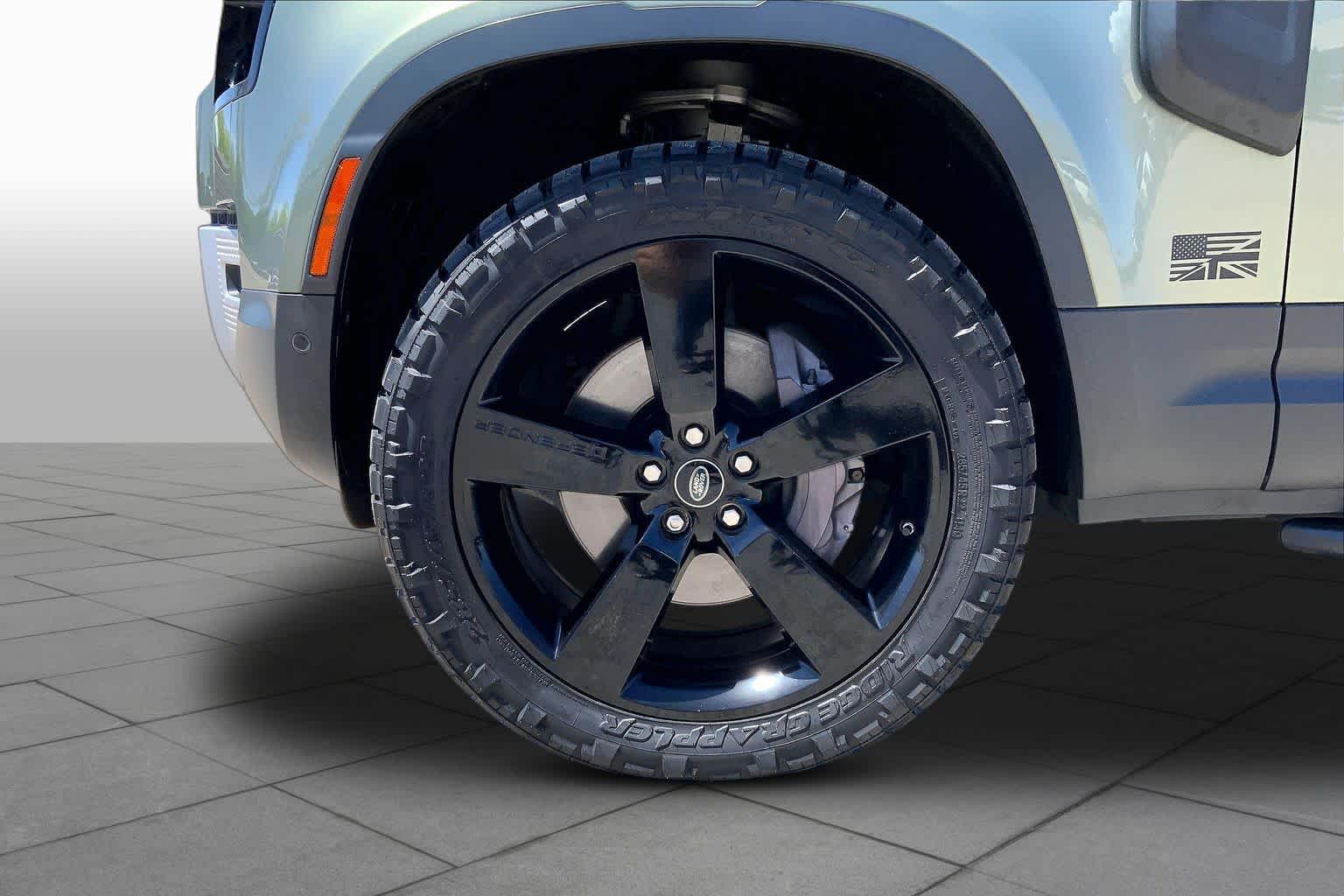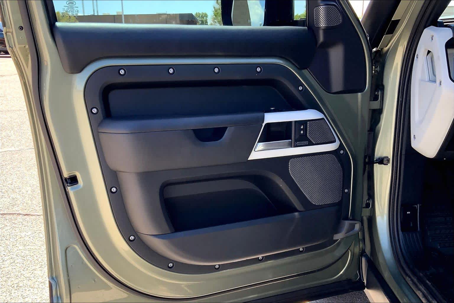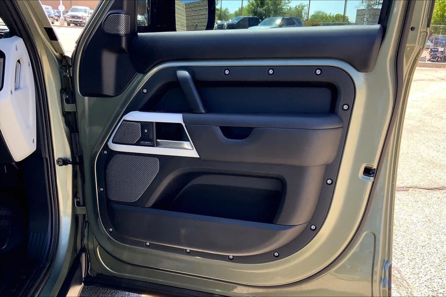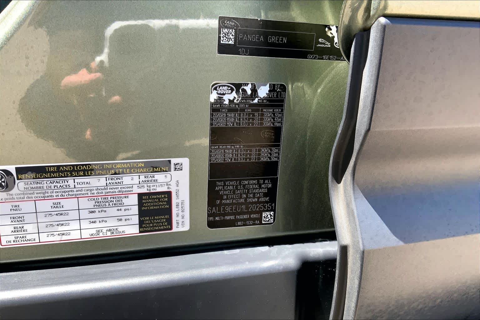 WHEELS: 22 GLOSS BLACK STYLE 5098: 5 spoke, Tires: 22 All-Season, MANUAL HEATED 3RD ROW SEATS: GVWR: TBA, TOWING PACK: all terrain progress control, Terrain Response 2 and configurable Terrain Response, Advanced Tow Assist, Trailer Hitch w/Electrical Connector, ELECTRONIC ACTIVE DIFFERENTIAL: torque vectoring by braking, 3-ZONE CLIMATE CONTROL: chiller, HEAD-UP DISPLAY, CLIMATE REAR SEATS W/CENTER ARMREST: 60:40 load through, manual slide and recline, BLACK CONTRAST ROOF, PANGEA GREEN METALLIC, BLACK PACK: gloss black fender vents, Narvik black hood checkerplate and gloss black Defender script, Gloss Black Grille Bar, COMFORT & CONVENIENCE PACK: Premium Cabinet Lighting, Front Center Console Refrigeration Compartment, RADIO: 700W 15 SPEAKER MERIDIAN SURROUND SOUND SYS, WI-FI ENABLED W/DATA PLAN, SIRIUSXM SATELLITE RADIO & HD RADIO, 22 FULL-SIZE SPARE WHEEL, CABIN AIR IONIZATION, AIR QUALITY SENSOR, EBONY, WINDSOR LEATHER SEAT TRIM.