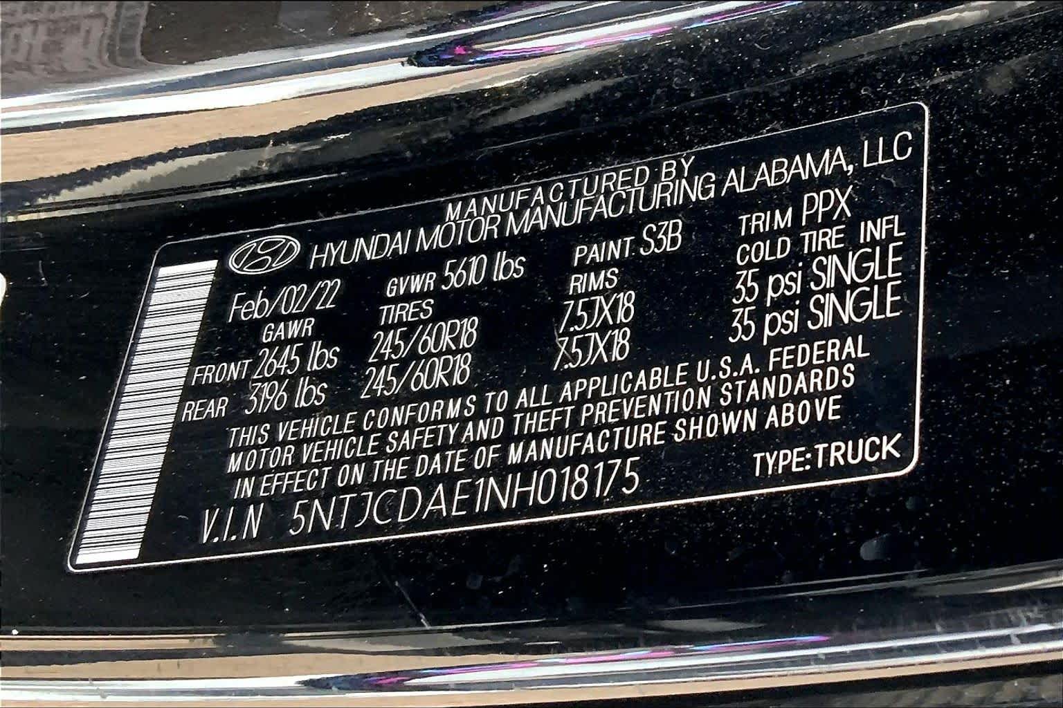 - VIN : 5NTJCDAE1NH018175